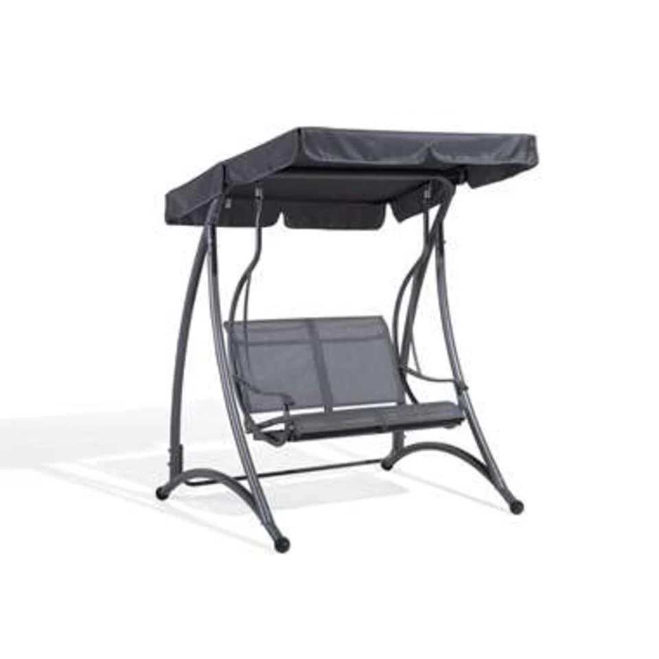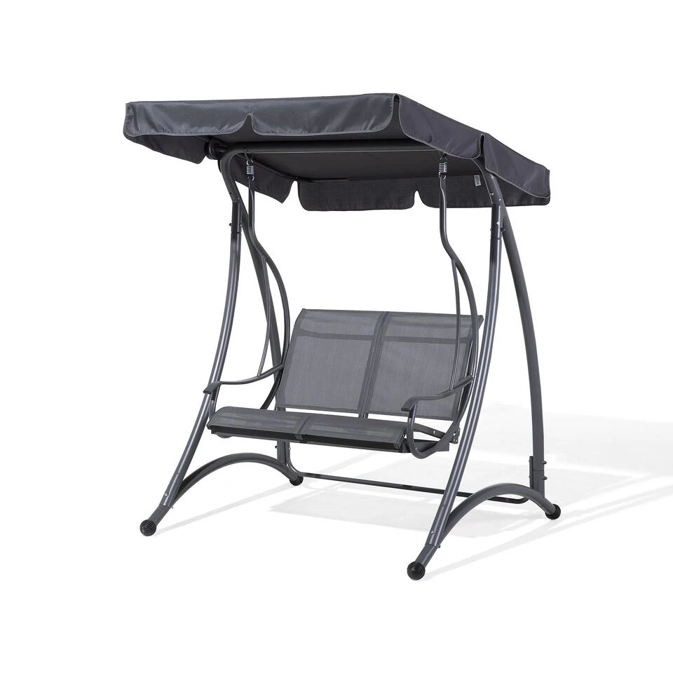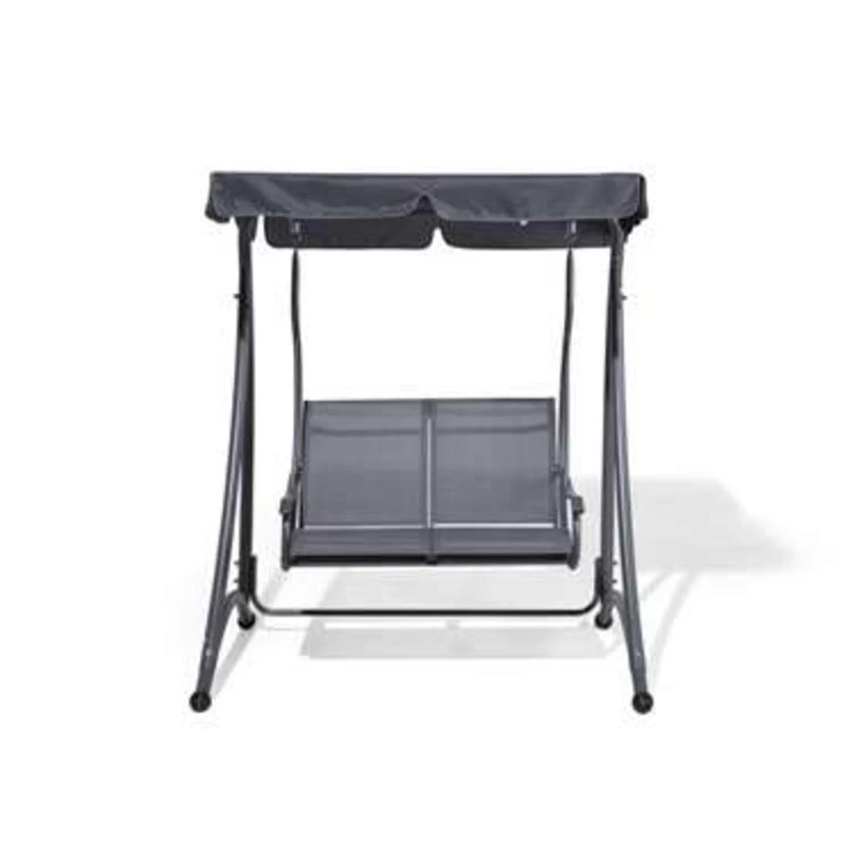 Comfortabele schommelbank in grijs. Deze comfortabele en aantrekkelijke 2-zits tuinschommel biedt een romantisch en comfortabel zitgedeelte voor de buitenruimte. Het geïntegreerde, instelbare zonnescherm, gemaakt van grijs, duurzaam polyester, zorgt voor aangename schaduw. De zonnekap is afneembaar en kan op 30°C worden gewassen. Het stevige en gebogen frame van grijs, gepoedercoat staal staat op vier stevige poten en geeft de schommel een moderne uitstraling. Maak het jezelf gemakkelijk op zonnige dagen!