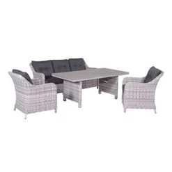 De Nova lounge dining is een zeer ruime stoel waar je heerlijk breed in kunt zitten. In deze stoel zit iedereen heerlijk. Of je nu lekker een boek wilt lezen, lekker wilt genieten van de zon of wilt dineren, deze stoel is er geschikt voor. De Nova lounge dining stoel is vervaardigd uit een onderhoudsvrij aluminium frame en weerbestendig half rond wicker kunststof vlechtwerkdraad in de kleur cloudy grey. Het draad heeft een dikte van maar liefst 5mm, wat zorgt voor een mooie robuuste uitstraling. Wicker is een stevig en duurzaam kunststof, waardoor je jarenlang kunt genieten van deze stoel. Het zit- en rugkussen is gemaakt van een hoogwaardige kwaliteit polyester. Het zitkussen is voorzien van een rits, waardoor het hoesje gemakkelijk met de hand gewassen kan worden. De rugkussens zijn voorzien van extra stiksels waarmee de stof op twee plekken naar elkaar wordt getrokken, wat zorgt voor een klassieke uitstraling. Deze stijlvolle look is geïnspireerd op de bekende klassieke chesterfield banken. Na gebruik kunnen de kussens opgeborgen worden in de schuur of een mooie kussenbox. Uiteraard kan de Nova lounge dining stoel los worden gekocht. Met bijvoorbeeld een bijzettafeltje in hetzelfde kleur vlechtwerk draad creëer je een gezellig plekje. Zie je jezelf al zitten met een bakje koffie in de ochtendzon? Daarnaast kan de Nova stoel gecombineerd worden met andere tuinmeubels uit de Nova serie, zoals: een driezits bank, lounge dining tafels, krukjes, lounge midden elementen en zelfs met een ruime hoekbank opstelling. En natuurlijk zijn al deze artikelen leverbaar in diverse kleurstellingen. De afmetingen van de stoel zijn: L 74 x D 72 x H 85 cm. Een uitgebreide collectie loungestoelen vind je binnen de categorie tuinmeubelen. Tuinmeubelen van verschillende mooie merken.