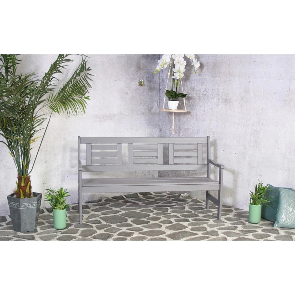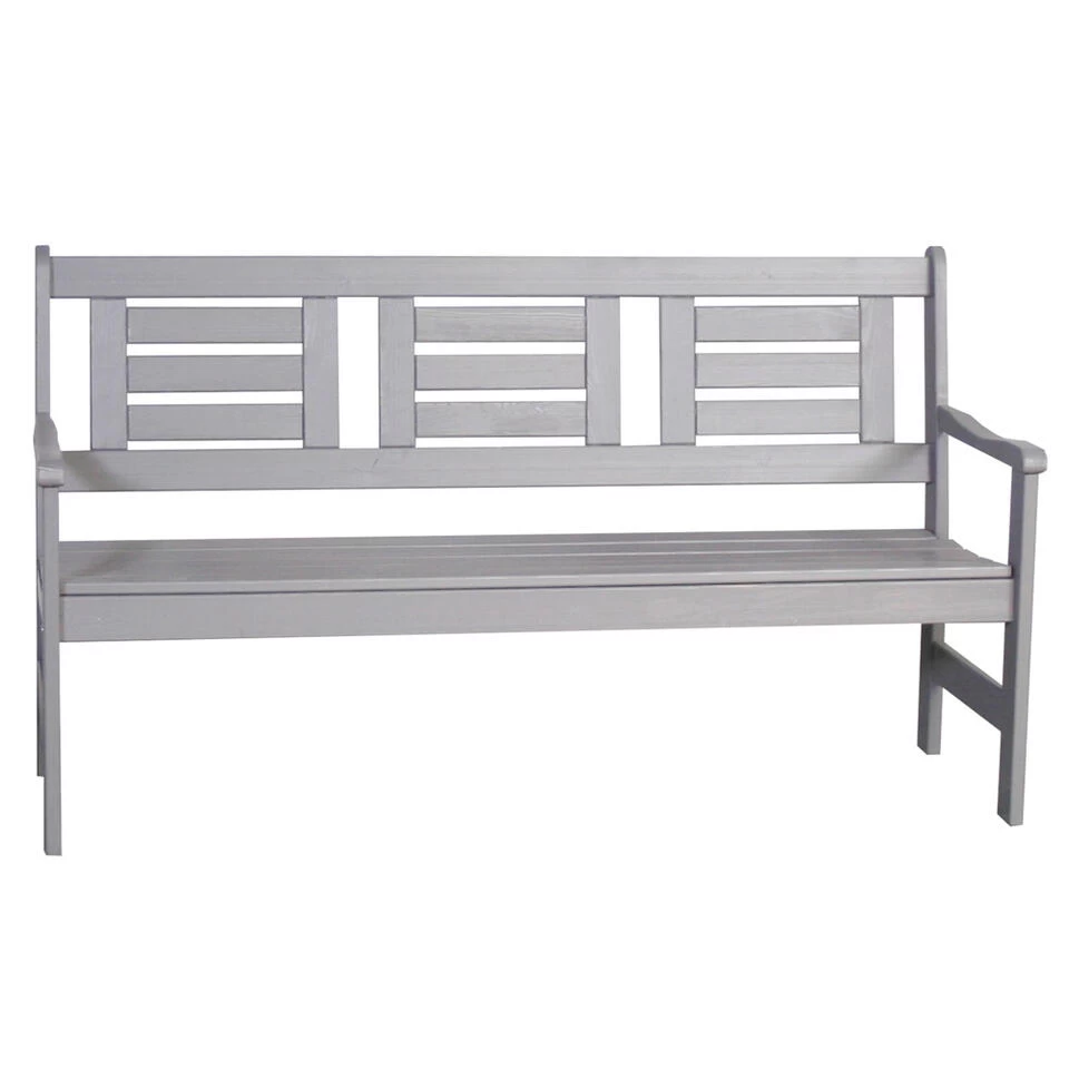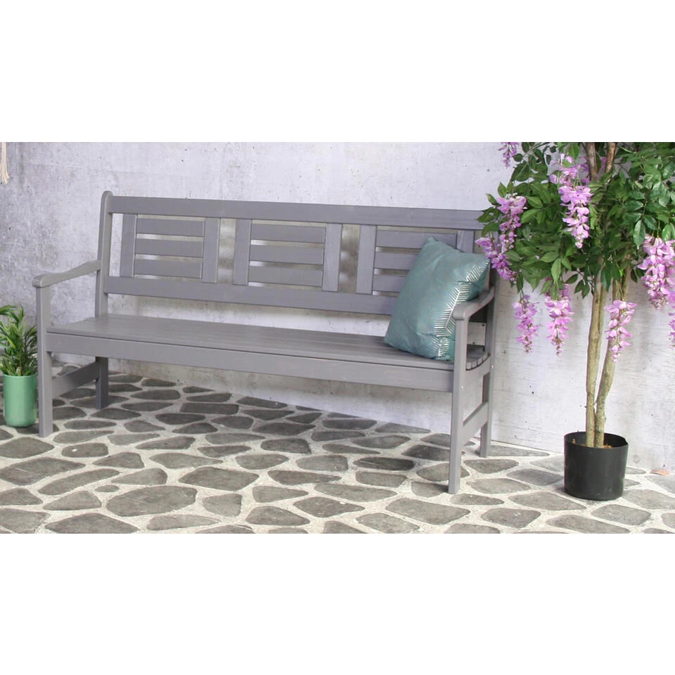 De compacte bank biedt 3 zitplaatsen voor in je (kleine) tuin, balkon of voortuin. De strak vormgegeven tuinbank is gemaakt van grenenhout en is gebeitst in een grijze kleur. Het 100% FSC gecertificeerde hout heeft een lange levensduur.