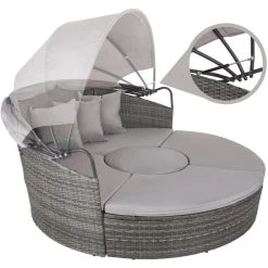 Het functionele wicker zonne-eiland van tectake wordt gekenmerkt door zijn aantrekkelijke design en zijn hoog zit- en ligcomfort. De combineerbare individuele elementen met waterafstotende kussens presenteren zich geheel naar smaak als meerdelige zitgroep of als groot loungebed. Het stabiele zonnedak is bevestigd met kleefsluiting en biedt opgespannen bescherming tegen hitte en wind. Het hoogwaardige vlechtwerk van duurzaam polyratan en het robuuste frame van staal maken dit veelzijdige wicker zonne-eiland van tectake tot het perfecte feel good-oase.