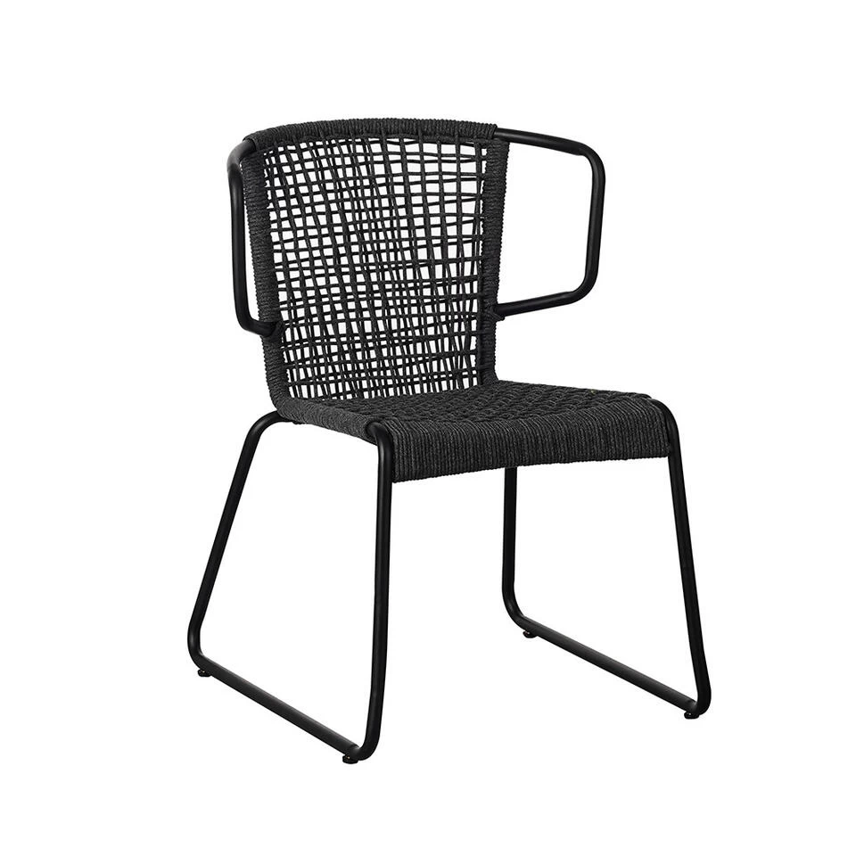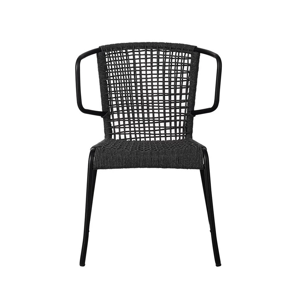 Deze tuinstoel is gemaakt van zwart metaal in combinatie met polyester. Het touw zit gevlochten rondom de rugleuning en armleuningen oogt stijlvol. Het voordeel van polyester touw is dat dit ideaal is voor buiten stoelen. Het touw zal snel drogen na een regenbui.